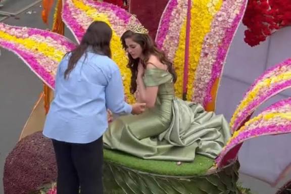 Mientras saludaba al público desde un carro alegórico, la reina de belleza perdió el equilibrio y cayó de rodillas, lo que causó preocupación entre los presentes.